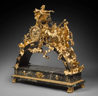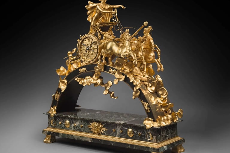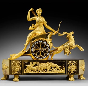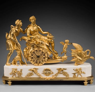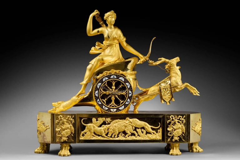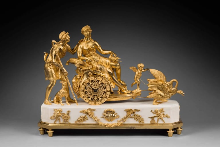 Often made of ormolu gilt bronze, these chariots are driven by classical divinities. The composition and details are directly inspired by ancient authors, and particularly by Ovid’s Metamorphoses. The best-known models of chariot clocks in the French Empire period are those with Diana, Venus, Apollo and Juno.