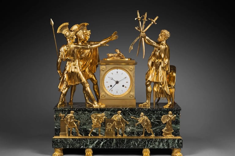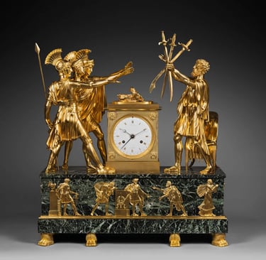 Ancient history, especially that of Rome, constituted another major theme for French Empire clocks. This tendency is particularly visible in the neoclassical compositions of Jacques-Louis David (1748-1825). The patriotic feelings elicited by these works contributed to expressions of contemporary patriotism.